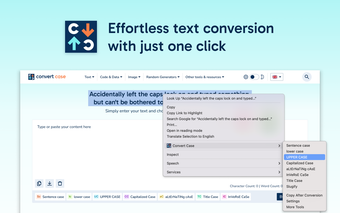 이 확장 프로그램은 여러 번 업데이트되어 기능성과 사용자 경험이 향상되었습니다. 주목할 만한 기능으로는 Disqus 및 Reddit 지원과 WYSIWYG 편집기가 포함됩니다. 최근 업데이트에서는 새로운 아이콘이 도입되었고, 신뢰성 문제를 수정했으며, 사용자에게 빠른 접근을 위한 사용자 정의 키보드 단축키를 제공했습니다. 이러한 개선 사항은 Convert Case를 브라우징 중에 텍스트 형식을 원활하게 관리하려는 모든 사람에게 유용한 도구로 만듭니다.